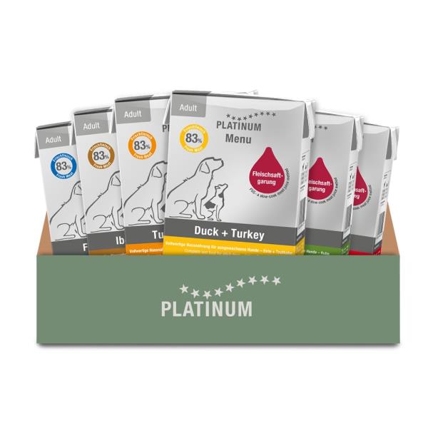 PLATINUM MENU, sem er fáanlegt í sjö ljúffengum bragðtegundum, er fyrsta hundablautfóðrið sem inniheldur amk 83% af fersku kjöti/fiski og er hægeldað í eigin safa án viðbætts vatns. PLATINUM hundablautfóðrið hentar fyrir allar tegundir á öllum aldri.